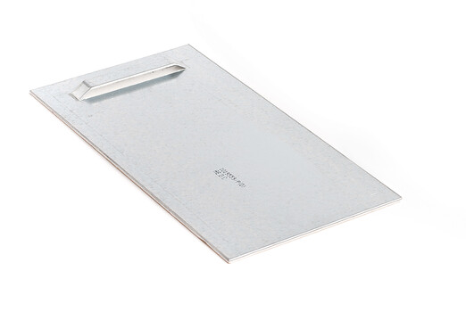 Ziehen Sie die Schutzfolie vom Aufhängeblech ab und drücken Sie diese kräftig und gleichmässig auf die Rückseite der Bildplatte.