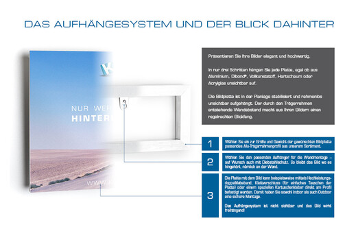 Wie können aber bedruckte Bildplatten dennoch, für den Betrachter ansprechend, rahmenlos an die Wand gehängt werden - ohne durch die Platte zu bohren und ohne die Verwendung der klassischen Wandabstandshalter?