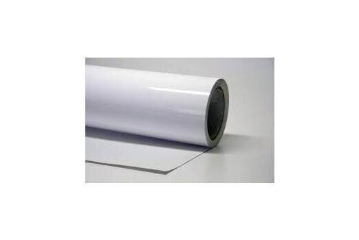 Polymere, weiße PVC-Druckfolie glänzend mit transparentem Kleber für langfristigen Innen- und Außeneinsatz, High-Stability-Klebertechnologie mit aufbauender Klebekraft.