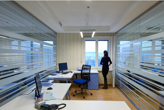 Polymere, transluzente Premium PVC-Druckfolie mit Frosteffekt (Glasdekorfolie) und Luftkanälen im Kleber (permanent) für langfristigen Innen- und Außeneinsatz.